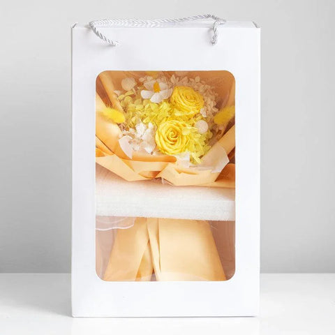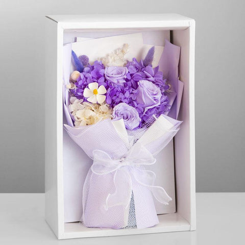 Filled with preserved billy buttons, hydrangeas and roses arranged in a vase. All posy stories come complete in a white window presentation box.