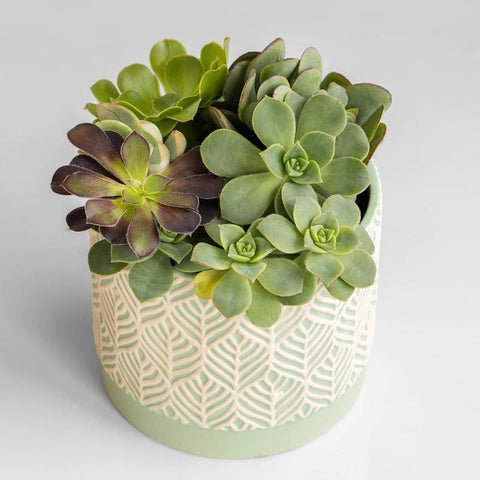 Our Jade succulent pot is filled with the titular crassula jade succulents & green houseleek (aeonium arboreum). Succulents are hardy plants that require little maintenance. Dimensions: 14H X 15W